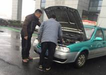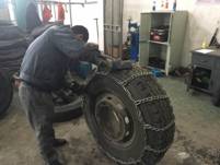 修理工正在為輪胎安裝防滑鏈 出租車司機在出車前對車輛進行檢查
