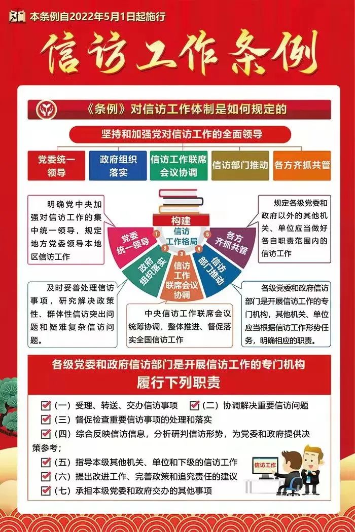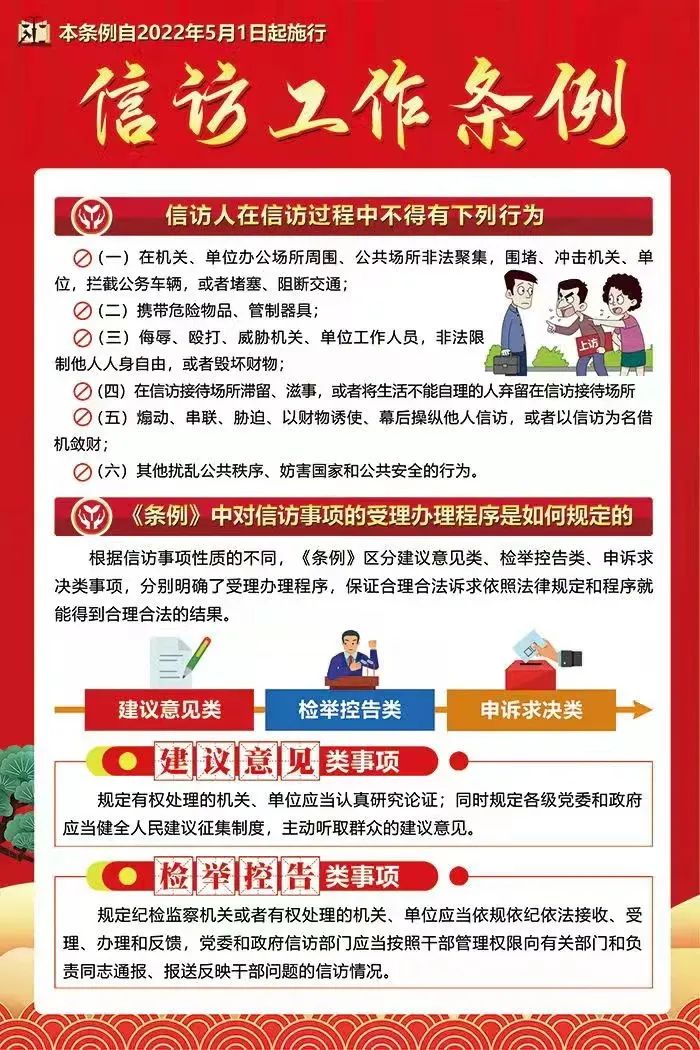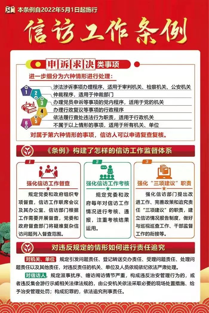 日前,中共中央、國務(wù)院印發(fā)的《信訪工作條例》全文公布,條例共6章50條,自今年5月1日起施行。條例詳盡規(guī)定了信訪工作的各環(huán)節(jié)事項(xiàng),以下亮點(diǎn)值得關(guān)注,一起來學(xué)習(xí)吧!